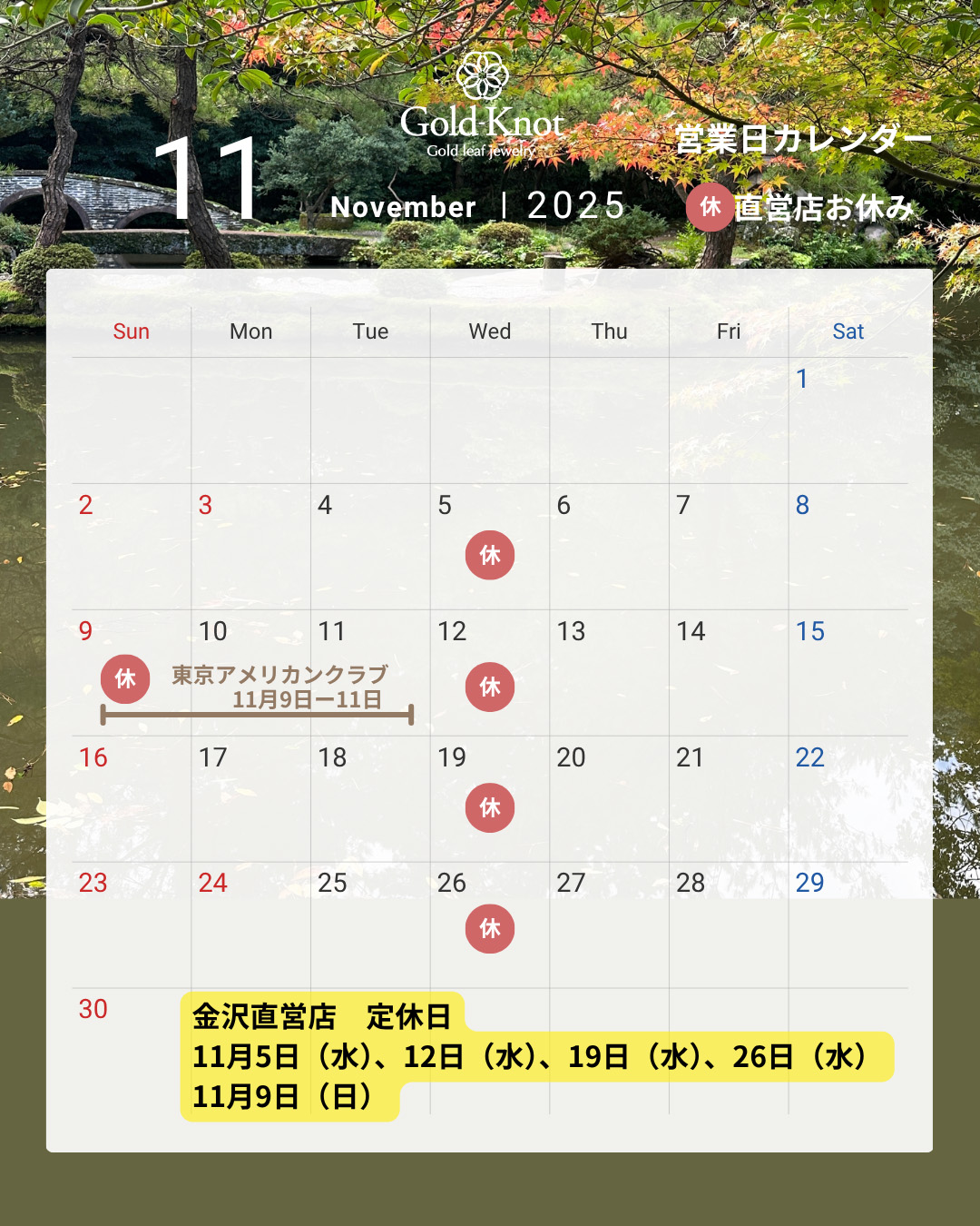 2025.10.31 お知らせ 11月営業日カレンダーです 金沢直営店 定休日 赤丸がお休みです11月5日(水)、12日(水)、19日(水)、26日(水)11月9日(日) 今月は、東京アメリカンクラブ(詳細)と直営店でご来店お待ちしていおります 2025.09.24 東武百貨店 池袋店10月1日-7日、出展いたします 2025.10.31 東京アメリカンクラブ『インターナショナルバザー出展』いたします 新着情報 一覧に戻る